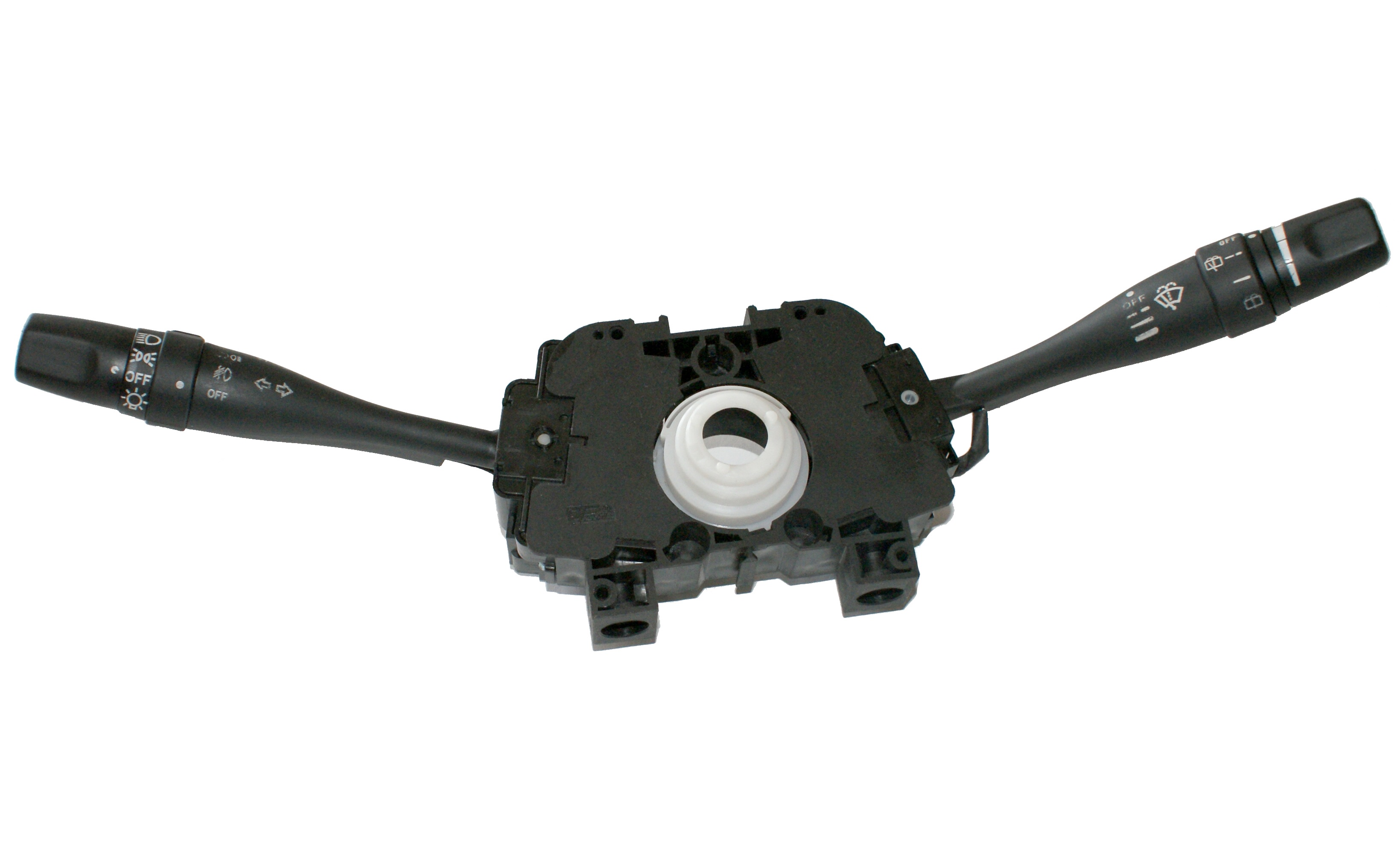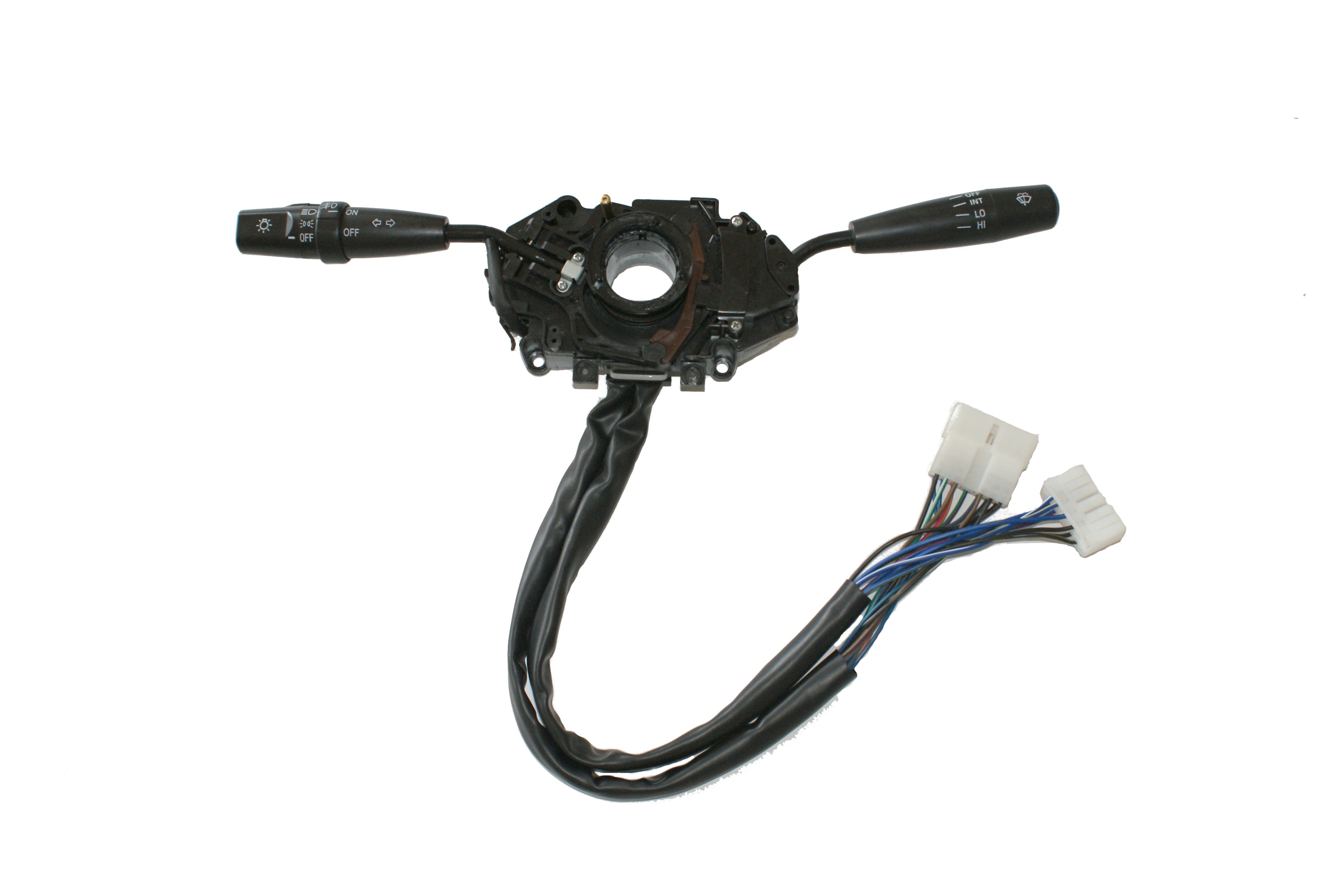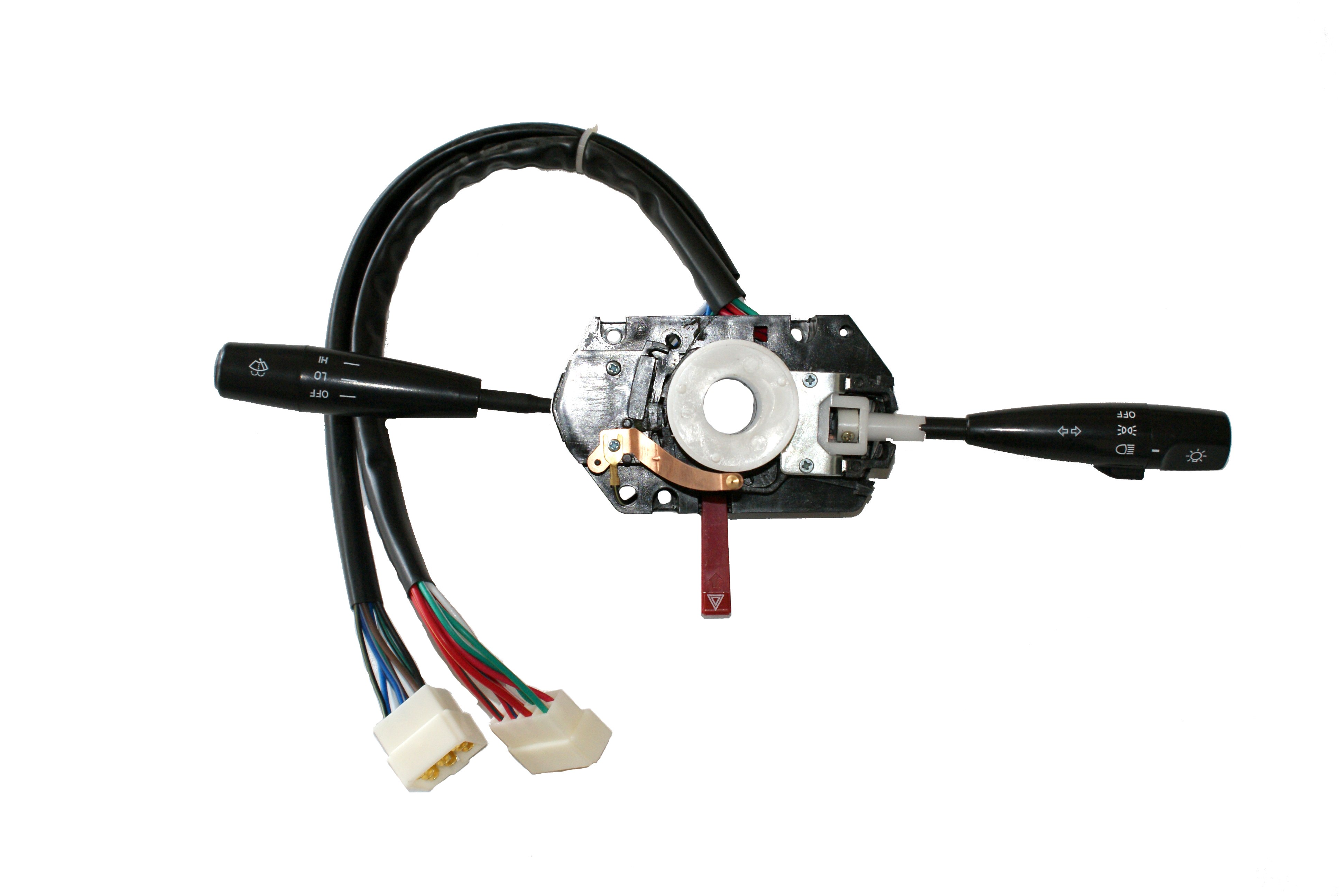 汽車組合開關一個操作手柄控制雨刮和洗滌器開關,另一個操作手柄控制轉向燈、車燈和變光開關,另外一些汽車組合開關還裝有喇叭開關和多個備用開關,可以控制汽車上多種電器的通斷。